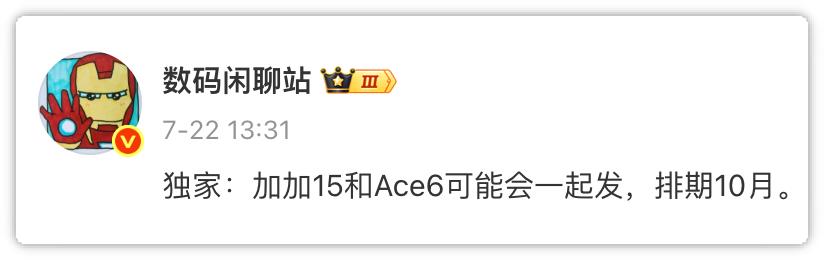 7月22日,數碼閑聊站爆料稱:“一加15和Ace6可能一起發,排期10月。”