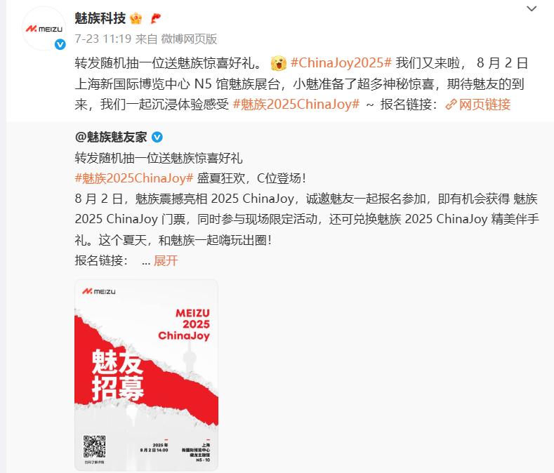 更值得關注的是, 7 月 23 日魅族官方宣布 8 月 2 日亮相 2025 ChinaJoy 驍龍館的消息。緊接著7月24日,魅族早期核心元老黃質潘接任星紀魅族 CEO的消息,也引發了網友對魅族的持續關注。魅族近期一系列動作,被視為產品推進的重要信號。