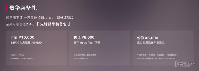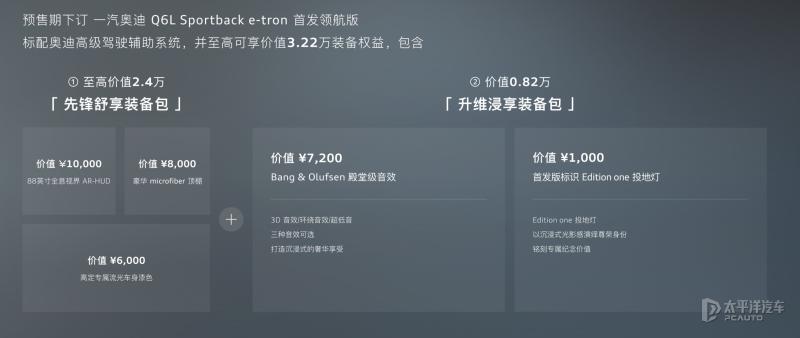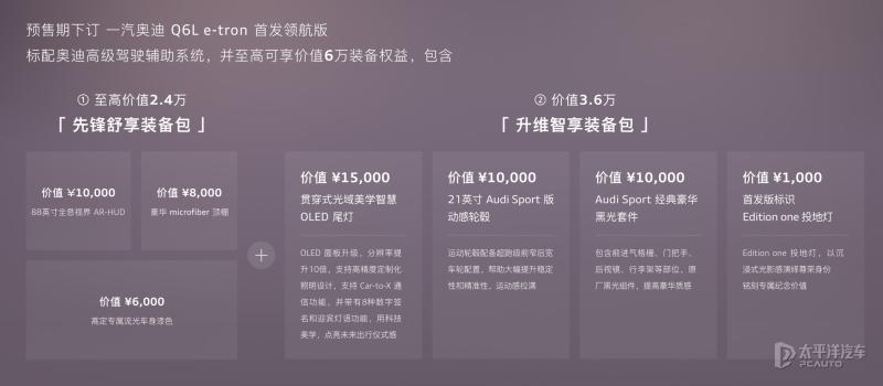 下訂一汽奧迪Q6L e-tron超長續航版與一汽奧迪 Q6L Sportback e-tron超長續航版均可享受至高2.4萬元的“先鋒舒享裝備包”。