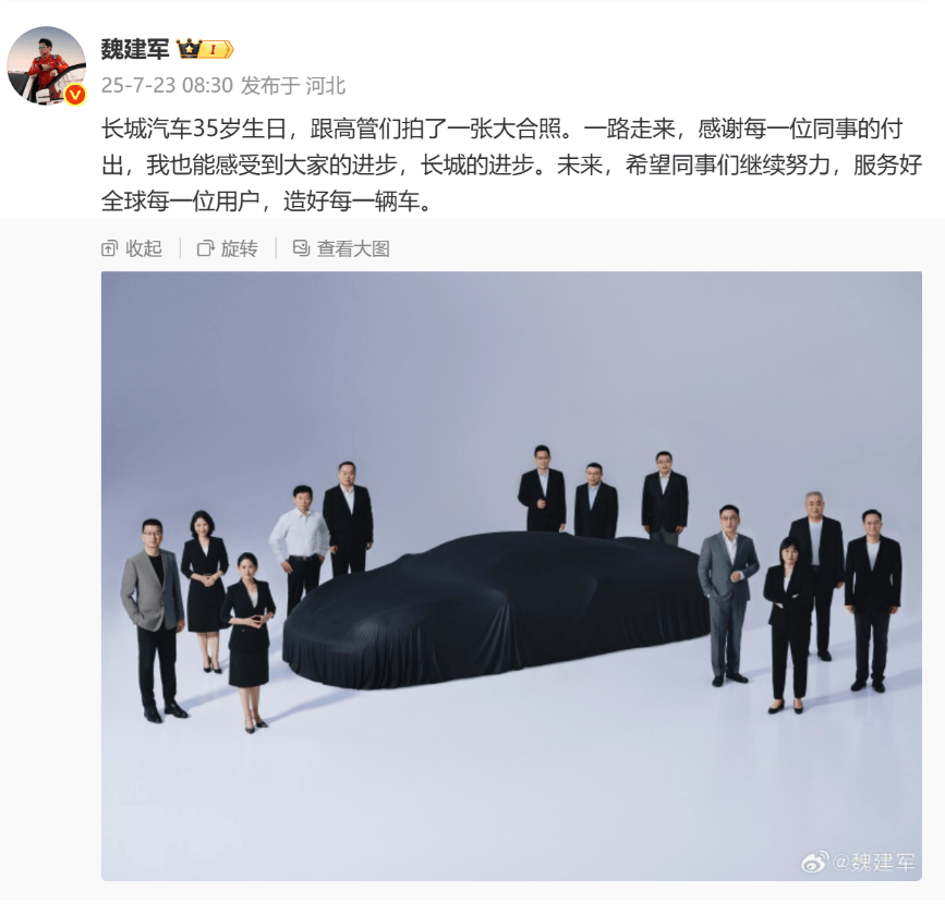 7月23日,長城汽車董事長魏建軍曬出的一張長城汽車35歲生日高管大合照意外引爆車圈。照片中,數十位高管分列站立,但真正的C位主角卻被一塊神秘黑布覆蓋,低趴的車身輪廓已經宣告長城汽車即將進入超跑領域。