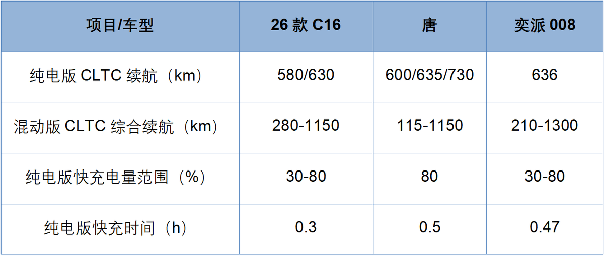 作為各自家族的“拳頭產品”,主機廠都用上了自家的核心技術。比如26款C16純電版采用了800V碳化硅高壓平臺,CLTC續(xù)航(標準下同)進一步提升至630km,驅動電機功率進一步提升至220kW,耐力和爆發(fā)力都更強;而增程版CLTC純電續(xù)航(標準下同)增加到280km,使得綜合續(xù)航來到1150km;同時直流快充30%至80%的時間縮短至19分鐘,跑得更遠,補得更快。唐純電版續(xù)航有三個“段位”,分別是600km、635km、730km,而插混版純電續(xù)航只有115km,綜合續(xù)航則同樣為1150km;奕派008純電版續(xù)航636km,增程版純電續(xù)航為210km,綜合續(xù)航達到了1300km。可以看出,三款車純電版本主打續(xù)航都在630km左右,滿足日常使用一般不成問題,但快充效率上,26款C16更快;而混動版續(xù)航也都超過了1100km,更適合長途出行。當前正值暑假期間,也是一年當中自駕游玩最頻繁、最合適的時節(jié),在續(xù)航和補能效率上做文章,使得遠途耐力更好,補能效率更高,這是有的放矢的做法。