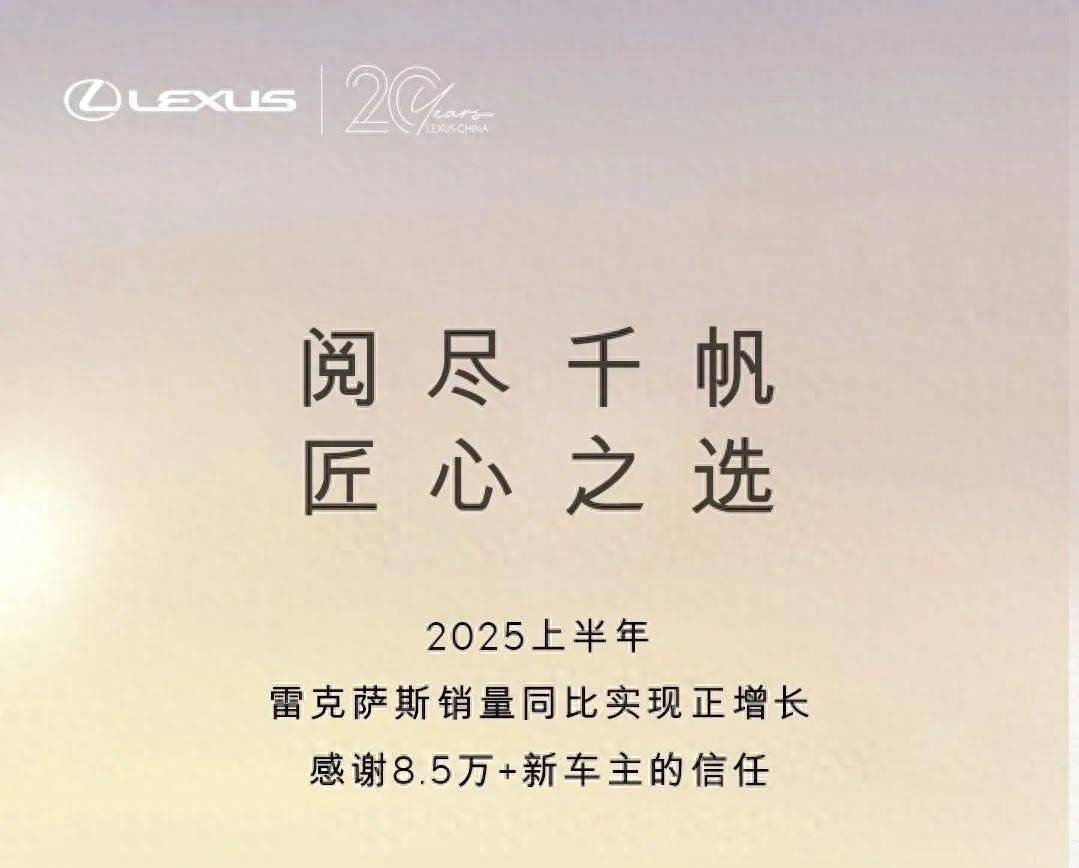 向來低調內斂的雷克薩斯,卻成為進口豪華車市場寒冬中的一抹亮色。“順,不妄喜;逆,不惶餒”,作為進入中國市場20年的馬拉松型選手,雷克薩斯再次展示自己的耐力與實力,邁著特立獨行的步伐,其2025年“期中考”的成績亮點,不僅是在進口豪華車市場又奪魁,更抓人眼球的是“唯一同比正增長的進口豪華車”。