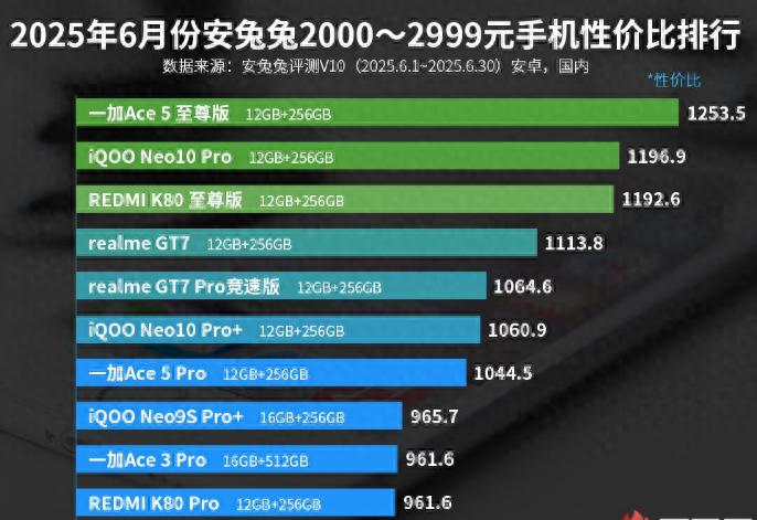 最后,在安兔兔2025年6月份2000—2999元手機性價比排行榜中,一加Ace5 Pro和iQOO Neo9S Pro+分列第七名和第八名。在安兔兔平臺上,這兩款智能手機的性價比評分分別為1044.5分和965.7分。在此之后,一加Ace3 Pro和REDMI K80 Pro分列第九名和第十名。在安兔兔平臺上,這兩款智能手機的性價比評分都是961.6分。其中,在屏幕上,REDMI K80 Pro使用了小米15系列同樣的華星光電M9屏幕發光材質,同時6.67英寸分辨率為3200x1440的2K屏幕。