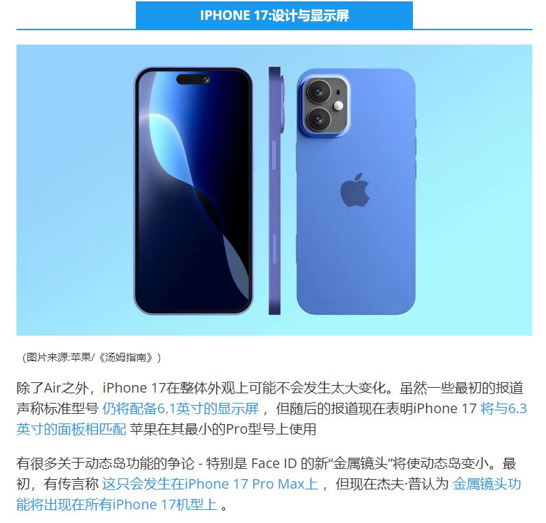 iPhone 17 Air 則鎖定極致輕薄路線,厚度預計僅 5.5?mm 左右,極具視覺沖擊力