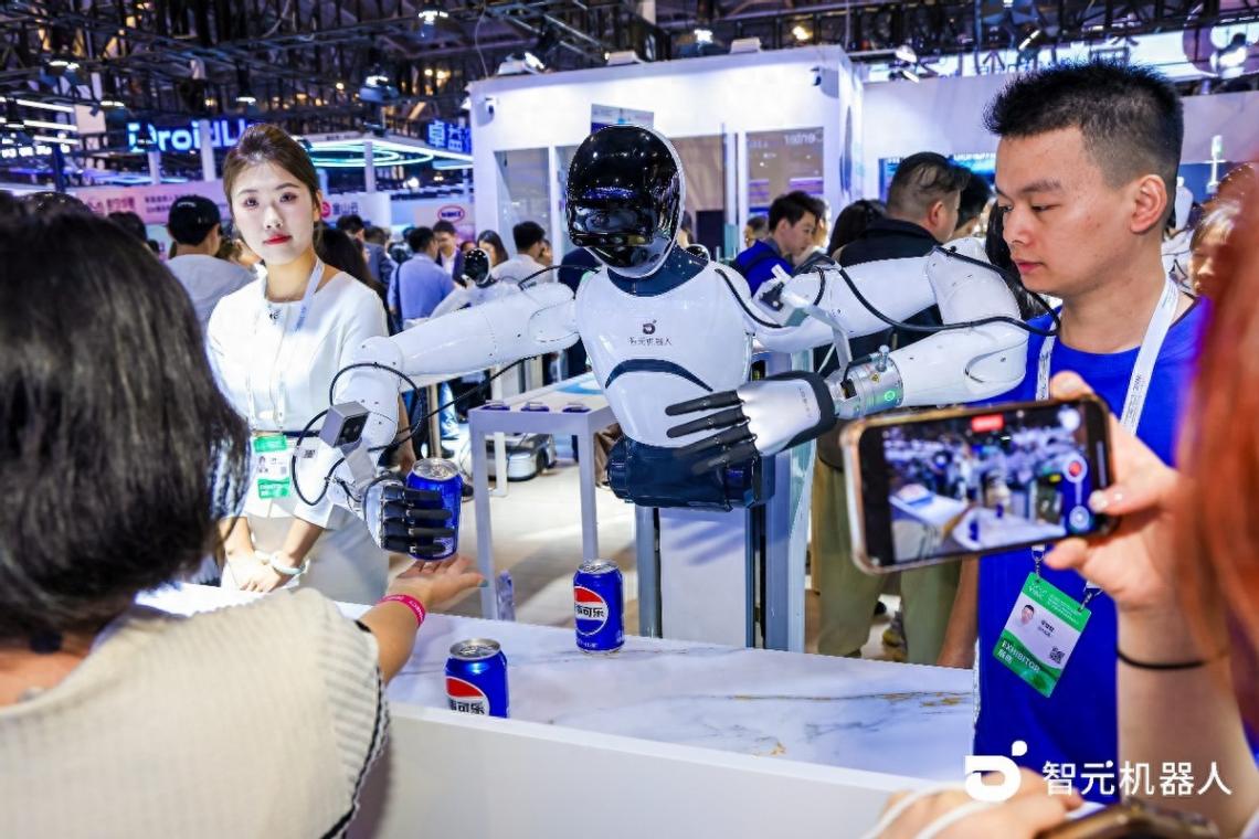 智元機器人展臺現(xiàn)場,精靈G1機器人正在給觀眾遞送可樂