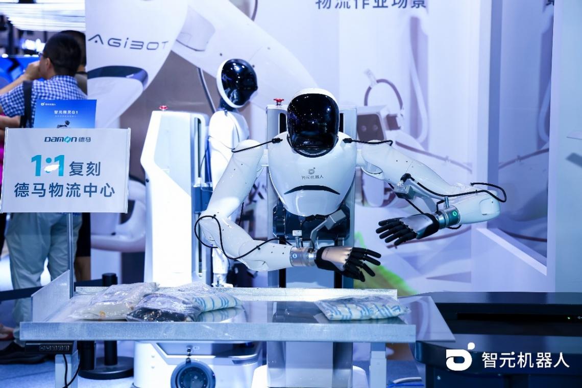 WAIC智元機器人展臺現(xiàn)場,精靈G1機器人正在分揀包裹