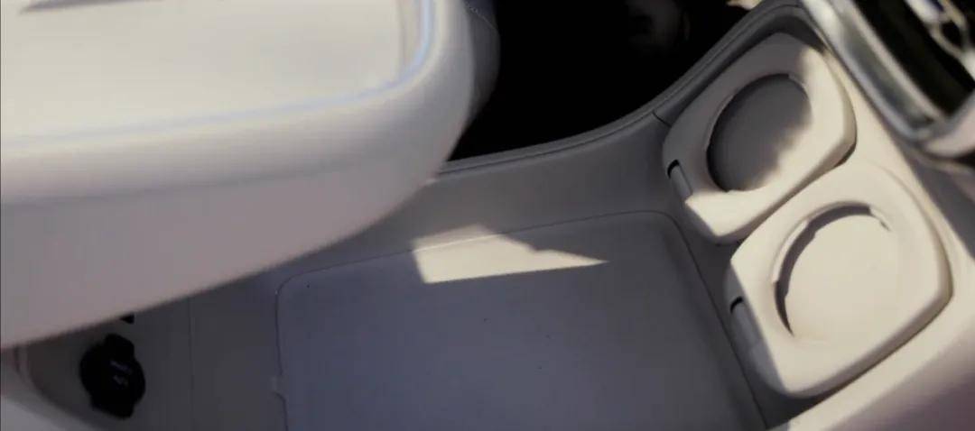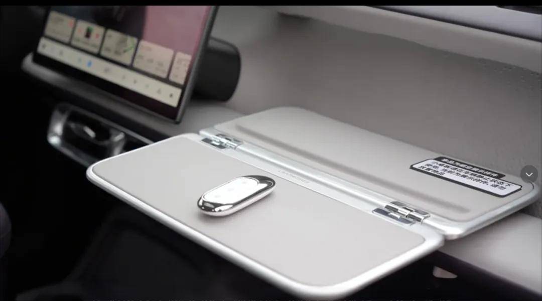 奇思妙想的小設計上,雖然沒有配備給副駕一塊娛樂屏,但為了照顧到副駕的乘坐體驗,在上方設計了六個魔術拓展塢,有點類似家里的洞洞板,可以讓自己去DIY,根據自己的喜好和需求去設計,比如說隨車贈送的的小折疊板,面積不大,和飛機上的小桌板差不多,用來放個電腦,臨時辦公還是很不錯的。