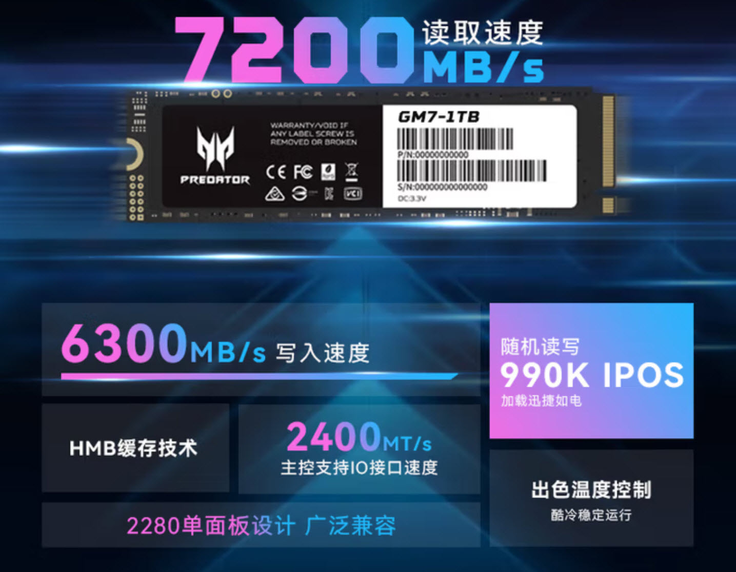 在存儲(chǔ)方面,宏碁掠奪者GM7000 1TB PCIe4.0 NVMe SSD是這套配置的理想選擇 。這款固態(tài)硬盤(pán)采用PCIe4.0×4接口,順序讀取速度高達(dá)7000MB/s,順序?qū)懭胨俣纫步咏@一水平 ,能夠大大縮短系統(tǒng)啟動(dòng)時(shí)間、程序加載時(shí)間和游戲加載時(shí)間。在《賽博朋克2077》等大型游戲中,GM7000 SSD可將游戲加載時(shí)間縮短約40%,顯著提升游戲體驗(yàn)。