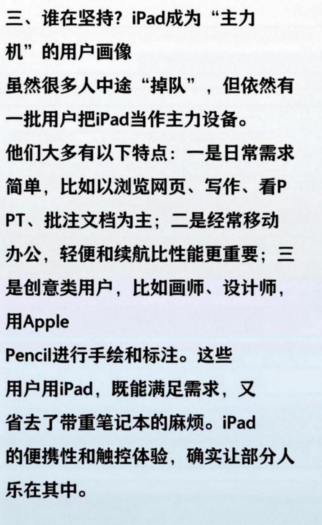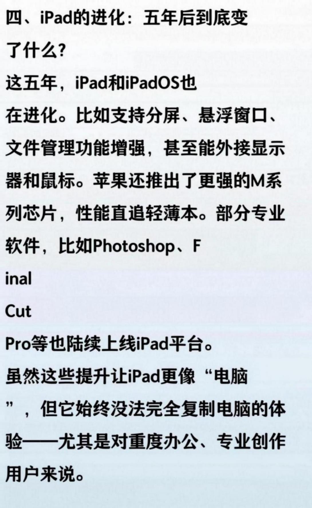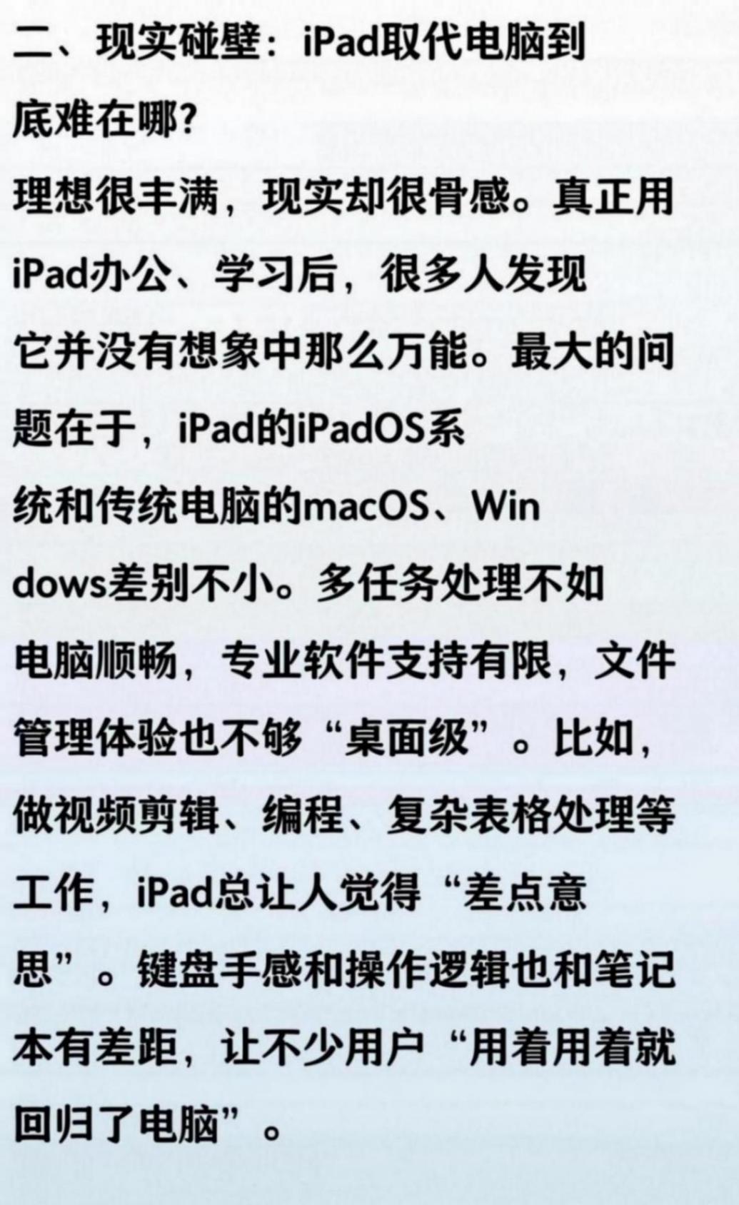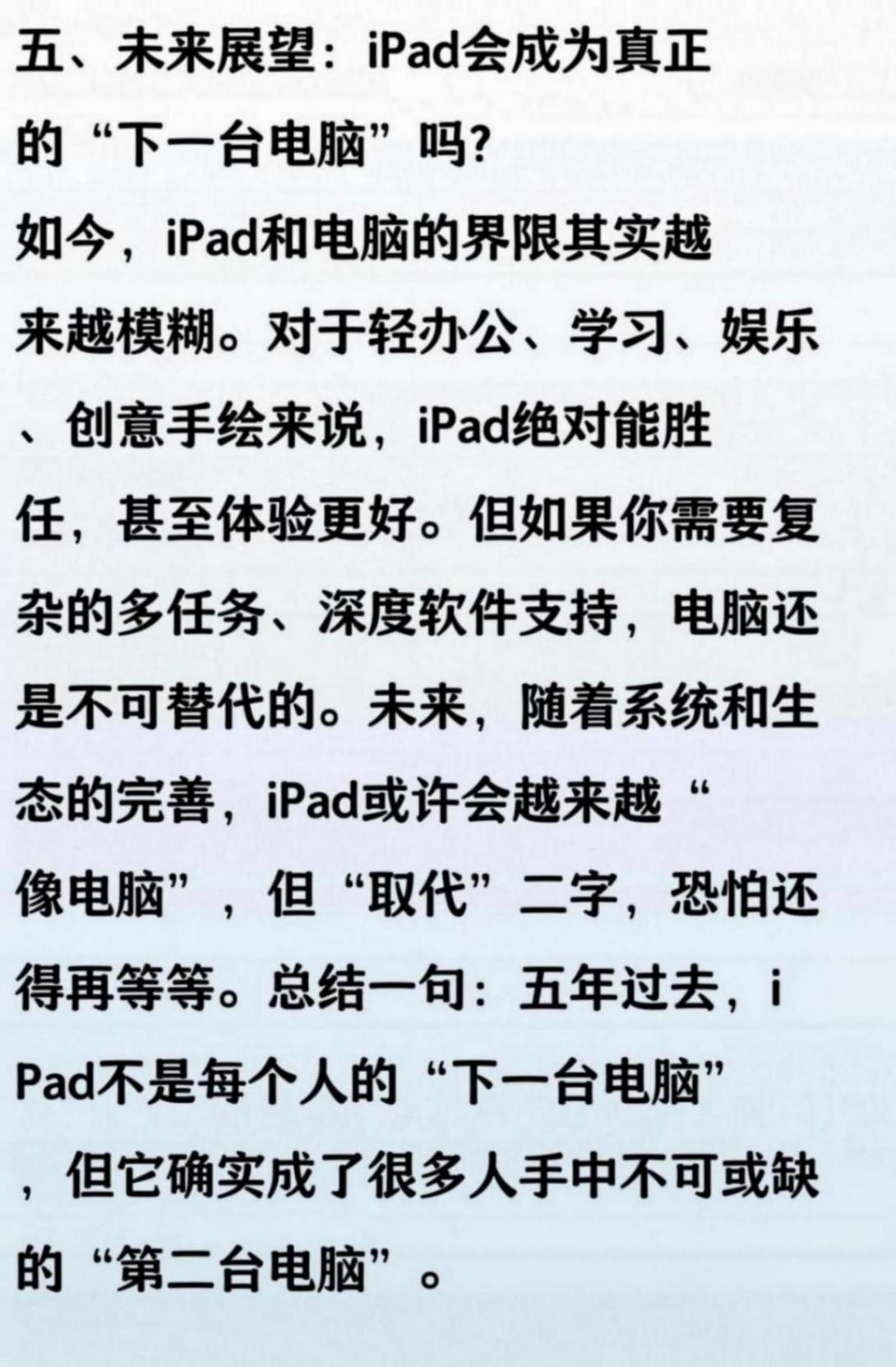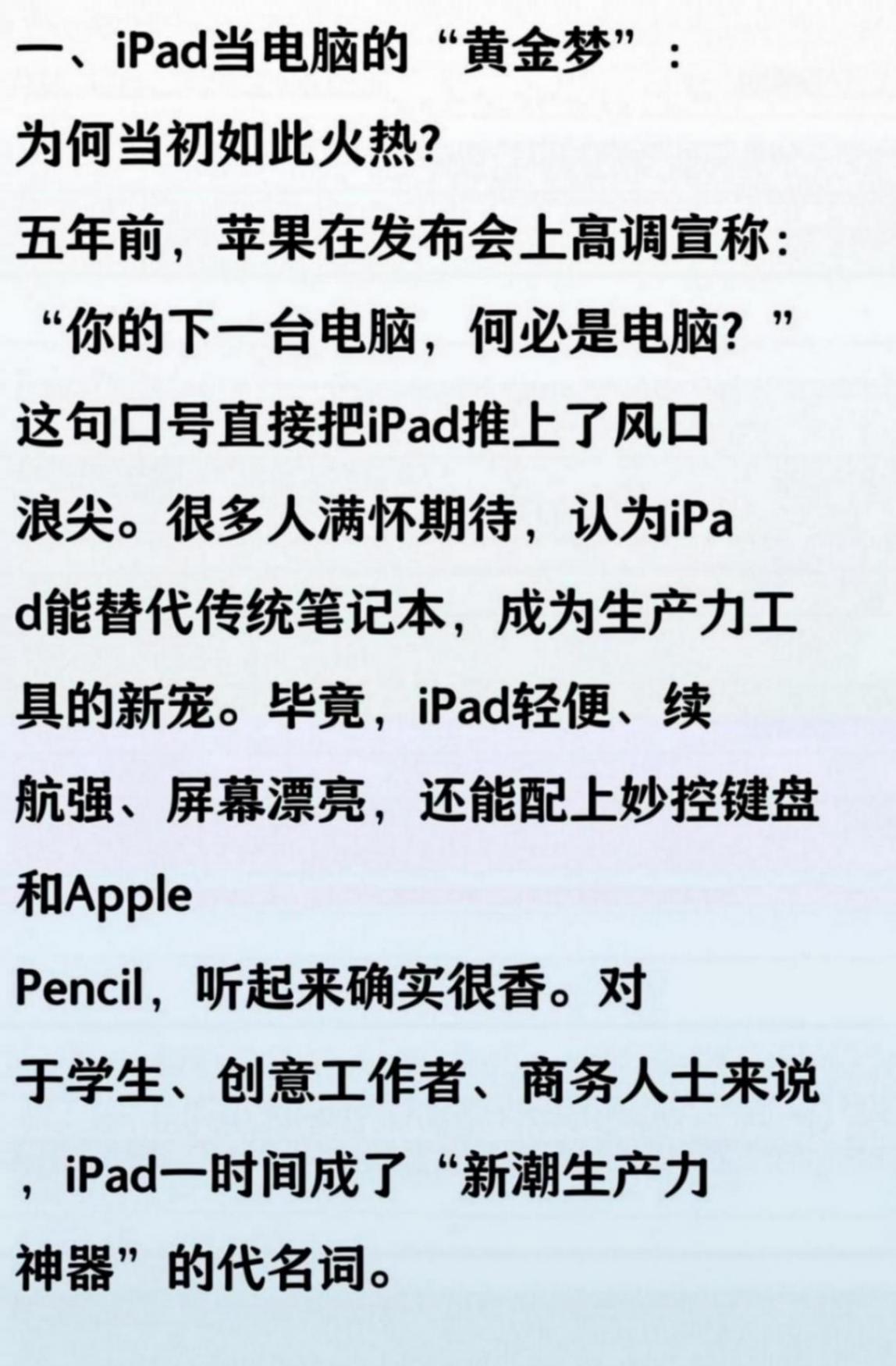 還記得五年前蘋果那句“你的下一臺電腦,何必是電腦”?當(dāng)時好多人都對iPad充滿期待,想著它能替代筆記本,結(jié)果現(xiàn)在回頭看看,真正堅持用iPad辦公的人其實不多。雖然iPad確實輕便,續(xù)航也不錯,但遇到復(fù)雜任務(wù)還是得靠電腦。說到底,iPad更像是個娛樂和輕辦公的工具,真要全靠它吃飯,還是有點難。