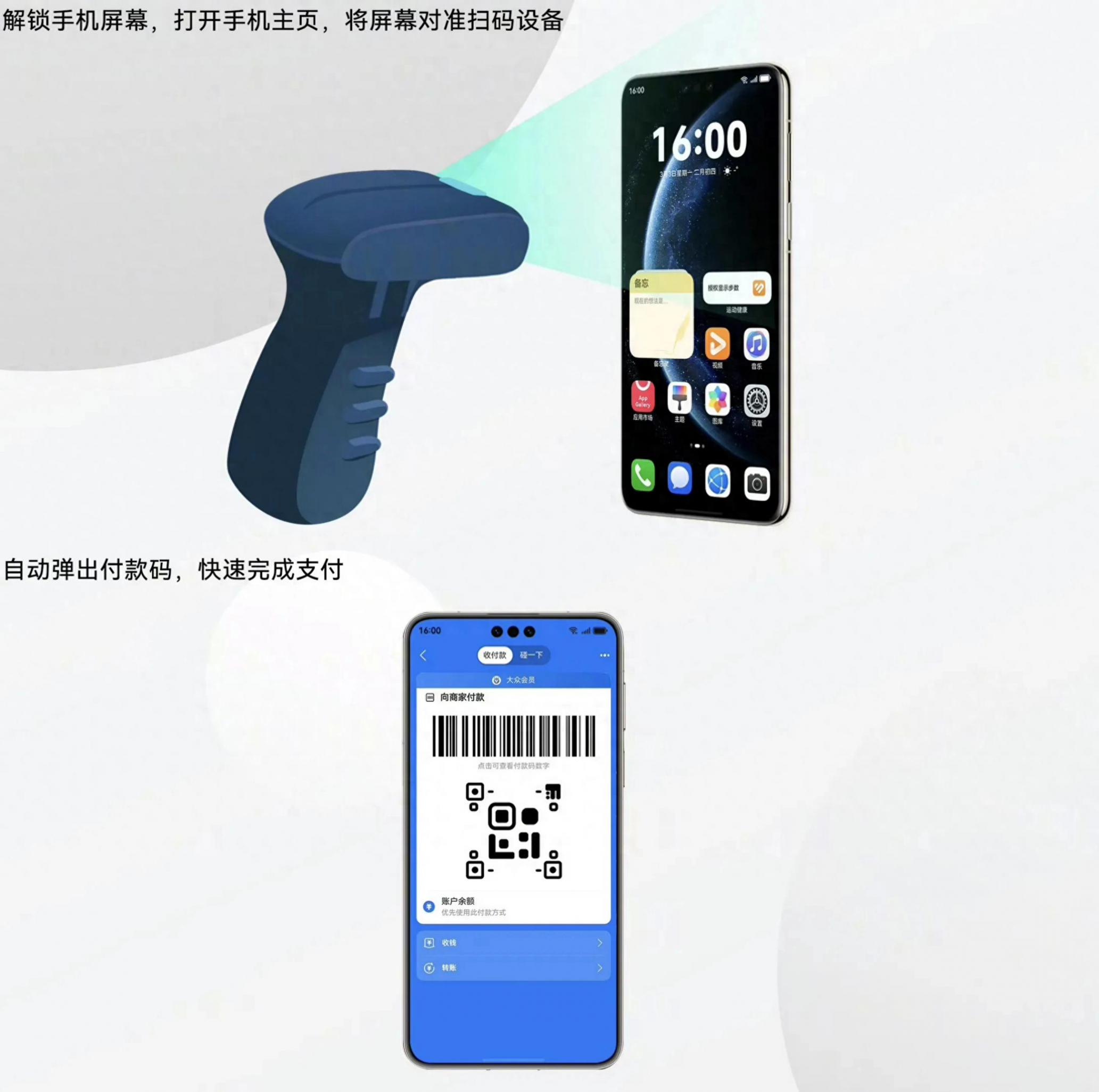 超市結賬時無需翻找付款碼——手機屏幕靠近掃碼器,自動彈出付款界面;
