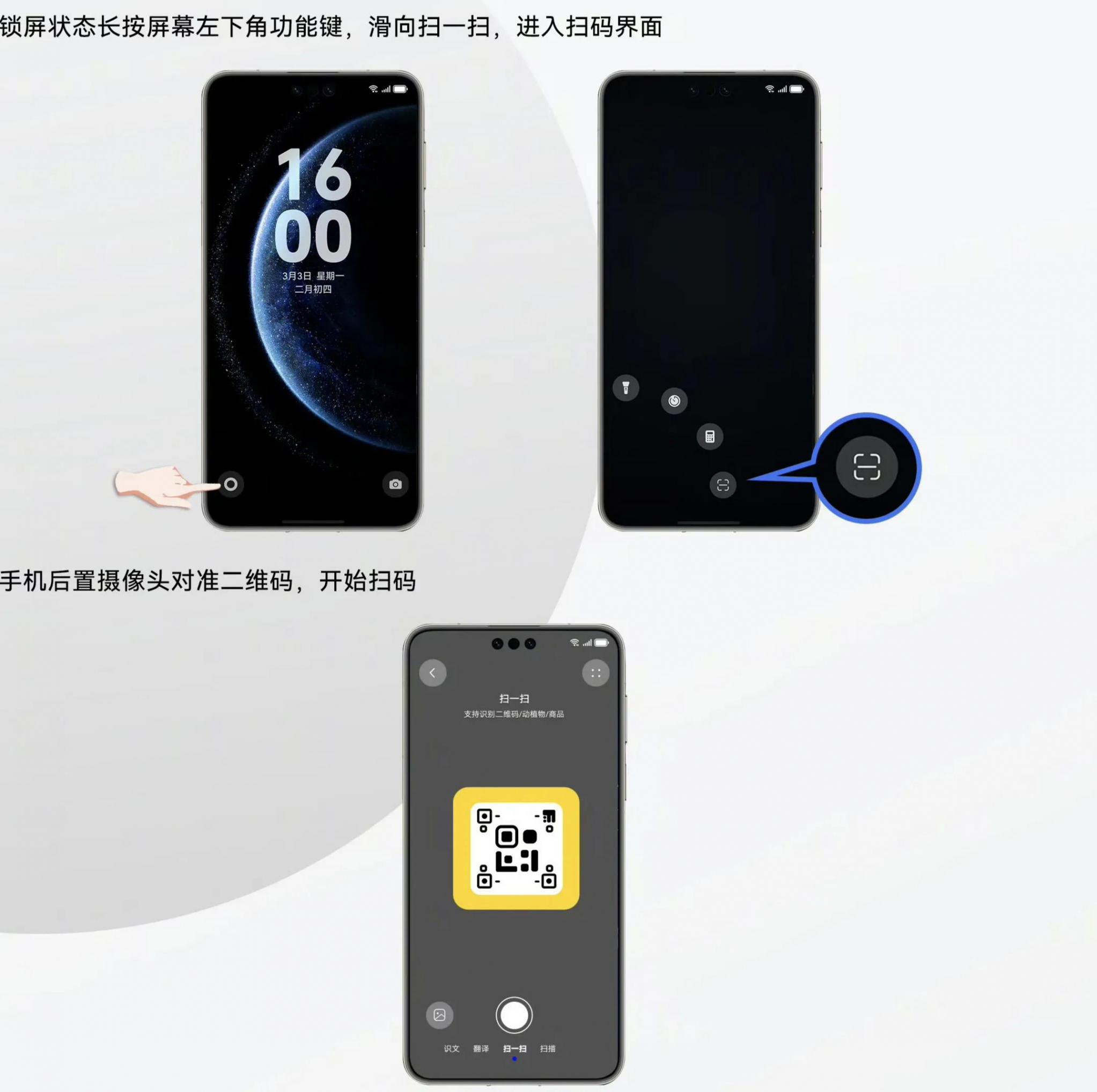 路徑:鎖屏狀態下喚醒手機屏幕>長按左下角功能鍵>滑向掃一掃>手機后置攝像頭對準二維碼,開始掃碼>掃碼成功。