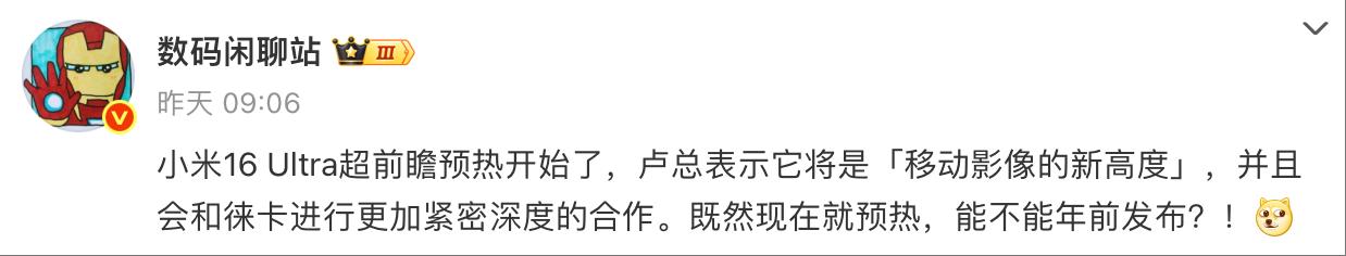 此外有博主發文稱,小米 16 Ultra 既然現在就開始預熱,不知道會不會在年前發布,另外盧總表示,這將是“移動影像的新高度”,并且會和徠卡進行更加緊密合作。