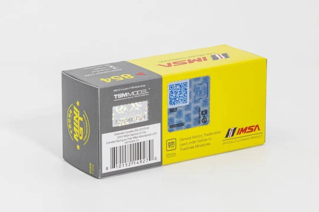 產(chǎn)品的包裝就不再累贅了,MINI GT標(biāo)準(zhǔn)風(fēng)格;黃色(車身同色)+深灰色紙盒有通用和IMSA賽事雙授權(quán),產(chǎn)品的編號是854;紙盒內(nèi)部是吸塑支撐,模型的車外后視鏡雖然是軟膠的,不怕碰掉。