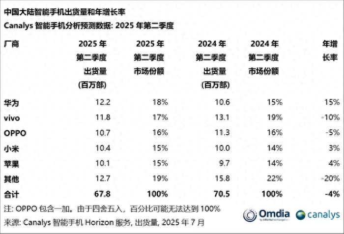 引獨立市場分析機構Canalys的今日研究數據稱,2025年第二季度,中國大陸智能手機市場出貨量同比下降4%,年初國家補貼政策帶來的增長效應逐步減弱。