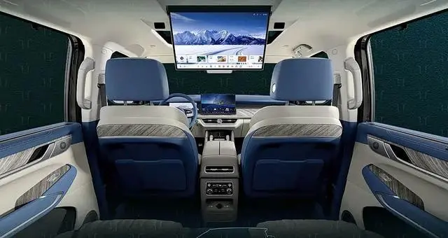 內飾方面,新車改用懷擋設計,配備 Nappa 真皮座椅,前后排座椅均支持通風、加熱、按摩,后排座椅則支持 25°-35° 靠背調節,車頂配有一塊 17.3 英寸 3K 吸頂屏,支持語音、手勢、觸控、手機、遙控、后排扶手屏 6 種控制模式,車內還配有 50W 壓縮機冷暖箱,溫域為-6°C 到 50°C。
