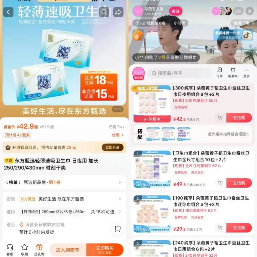 6月以來,東方甄選上線的第一款衛生巾,全網開售兩天內銷售18萬單。達多多數據顯示,自上線以來,僅在抖音平臺,銷售額預估高達1800萬元。讓黃子韜“賭上所有”力推的朵薇衛生巾,上線一個月也賣出了1.2億片,銷售額約8000萬元。