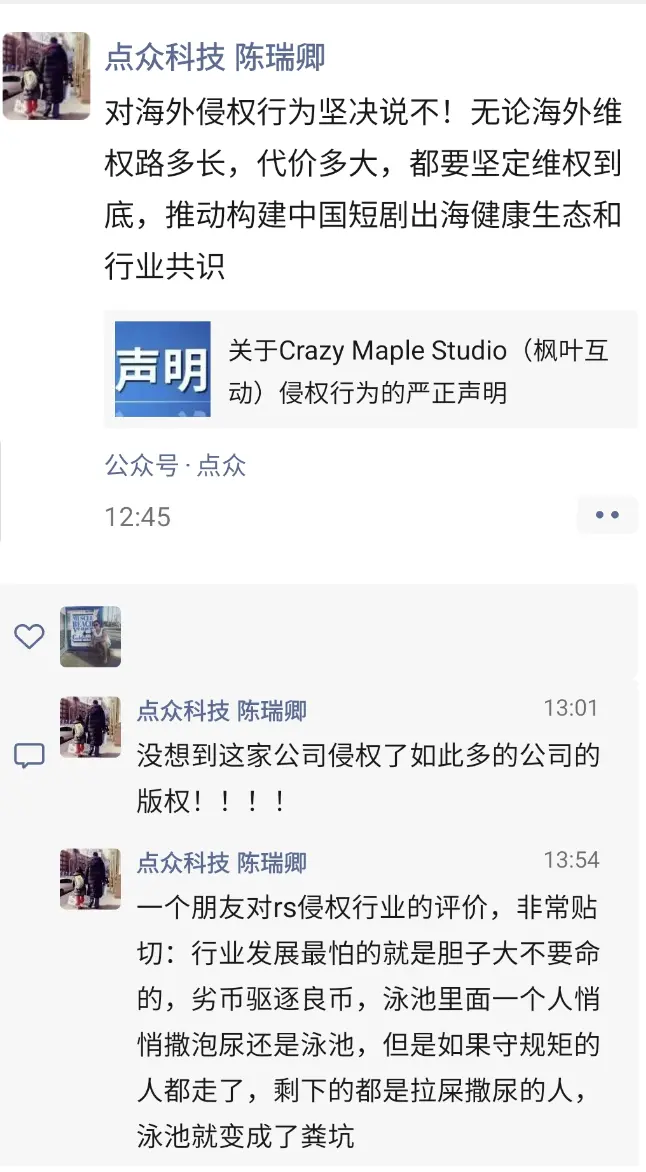 點(diǎn)眾科技CEO陳瑞卿在朋友圈里連發(fā)了三條相關(guān)動(dòng)態(tài),并表示,“無論海外維權(quán)路多長(zhǎng),代價(jià)多大,都要堅(jiān)定維權(quán)到底。”“這是劣幣驅(qū)除良幣。”