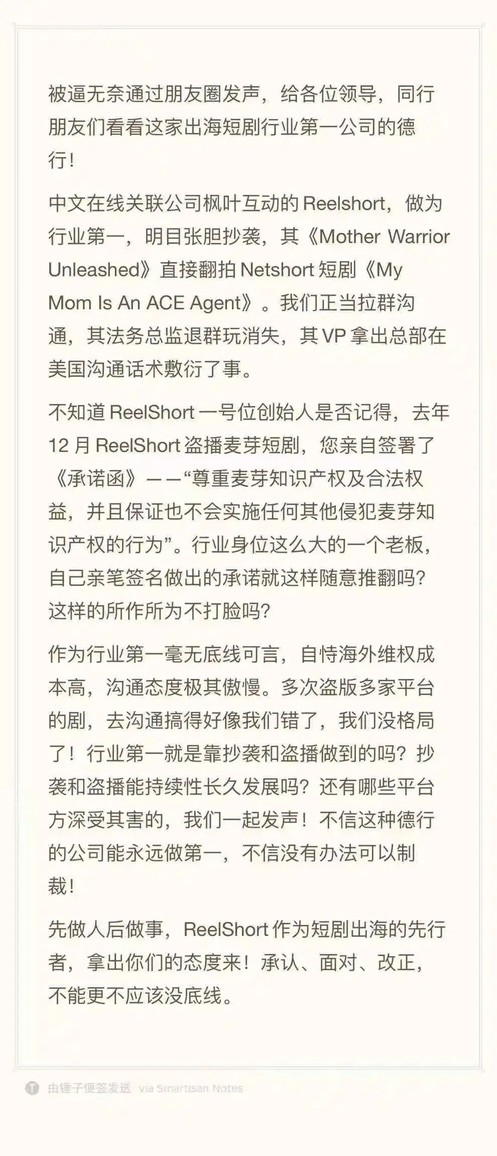 麥芽短劇海外負(fù)責(zé)人王利還在朋友圈分享稱:ReelShort的法務(wù)總監(jiān)曾從雙方的溝通群中突然退群消失,ReelShort的創(chuàng)始人曾親自簽署不會(huì)侵犯麥芽知識(shí)產(chǎn)權(quán)的《承諾函》但又隨意推翻,“被逼無奈通過朋友圈發(fā)聲。”