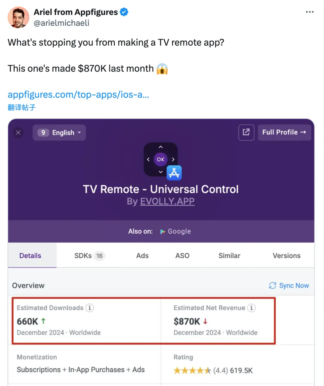 他貼了一張圖:一個(gè)名為 TV Remote (電視遙控器)的 App,在 2024 年 12 月掙了 87 萬(wàn)刀。