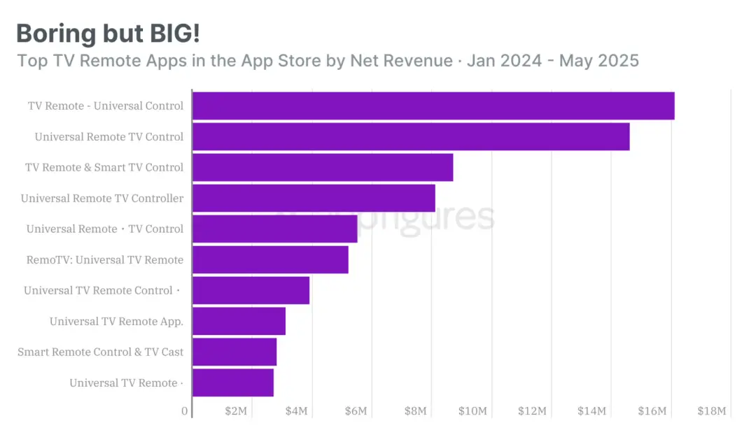 在 Appfigures 今年發(fā)布的“ Boring but BIG ”(沒(méi)創(chuàng)新但超賺錢)報(bào)告中,21 款電視遙控器 App 的年收入都超過(guò)了 100 萬(wàn)美元。