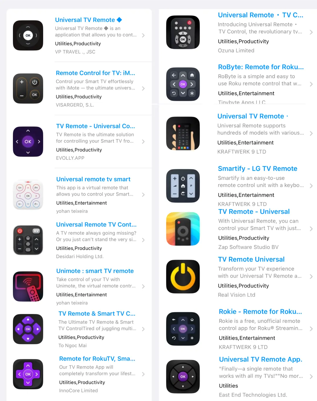 雖說(shuō)這些 App 名稱高度同質(zhì)化,也都配著一個(gè)酷似實(shí)體遙控器的圖標(biāo)。