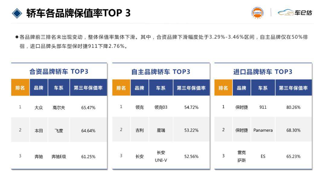 進(jìn)口品牌轎車保值率前三分別是保時(shí)捷911、保時(shí)捷Panamera和雷克薩斯ES。三者保值率均有不同程度下降,其中保時(shí)捷911下降2.76%,本月保值率為80.26%。相較于榜單第一名,保時(shí)捷Panamera和雷克薩斯ES保值率稍低,兩者均未突破70%。