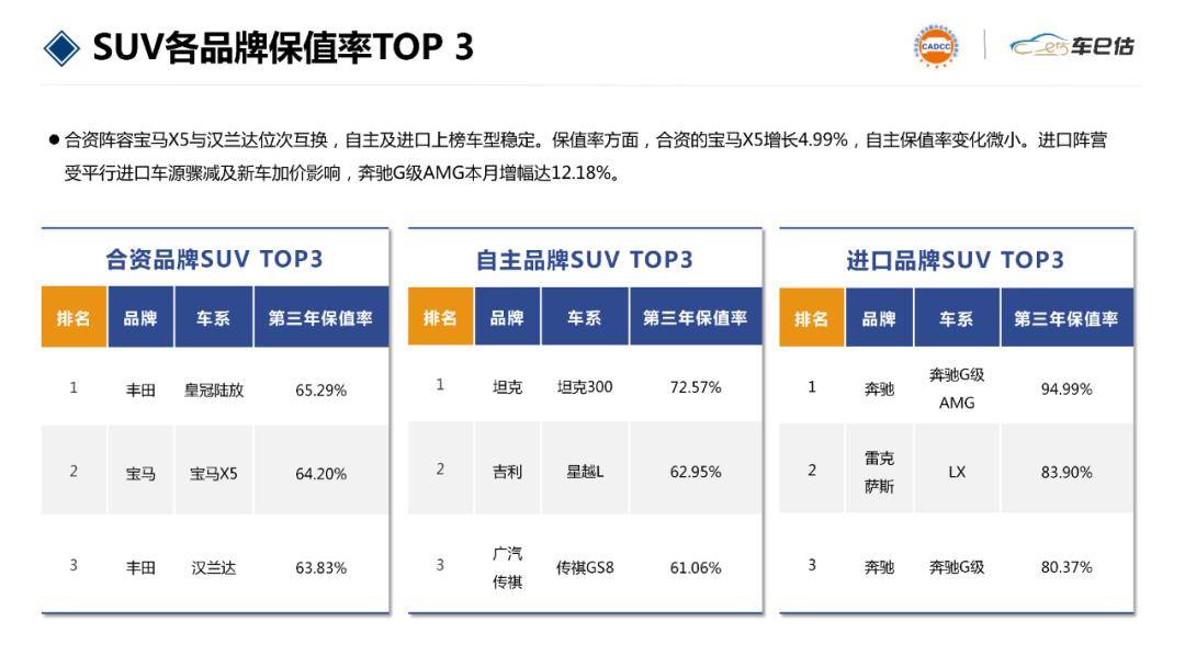進(jìn)口SUV逆勢走強(qiáng),大漲12.18%,保值率高達(dá)94.99%。位列第二,保值率環(huán)比漲3.05%至83.90%,奔馳G級亦有3.91%增幅。進(jìn)口車型一直處于供不應(yīng)求的狀態(tài),甚至存在加價(jià)提車現(xiàn)象,這極大地提升了其品牌價(jià)值和市場熱度,也間接推高了二手車保值率。