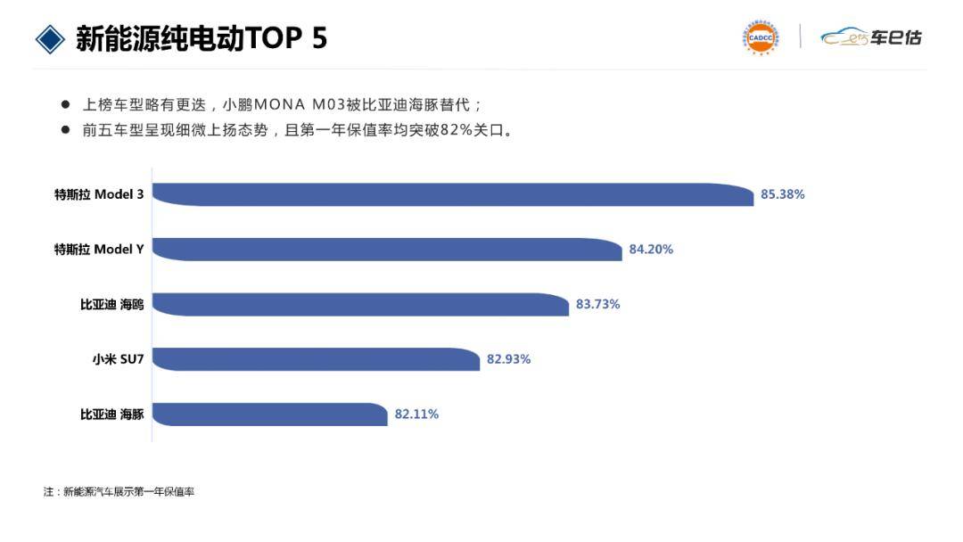 純電動車領(lǐng)域,特斯拉Model 3和Model Y這兩款車憑借強(qiáng)大的品牌號召力以及領(lǐng)先的自動駕駛技術(shù),在二手車市場備受追捧,高流通性為其保值率的穩(wěn)定提供了有力支撐。二者保值率與上月基本持平,維持在85%左右。排名第三的比亞迪海鷗以極高性價(jià)比成為城市代步熱門之選,保值率達(dá)83.73%。市場熱度極高的小米SU7本月排名第四,保值率較上月有小幅提升,達(dá)到82.93%。此外,比亞迪海豚小巧靈活的特性十分契合城市出行需求,在二手車市場擁有穩(wěn)定的受眾群體。本月取代小鵬MONA M03進(jìn)入榜單,保值率為82.11%。