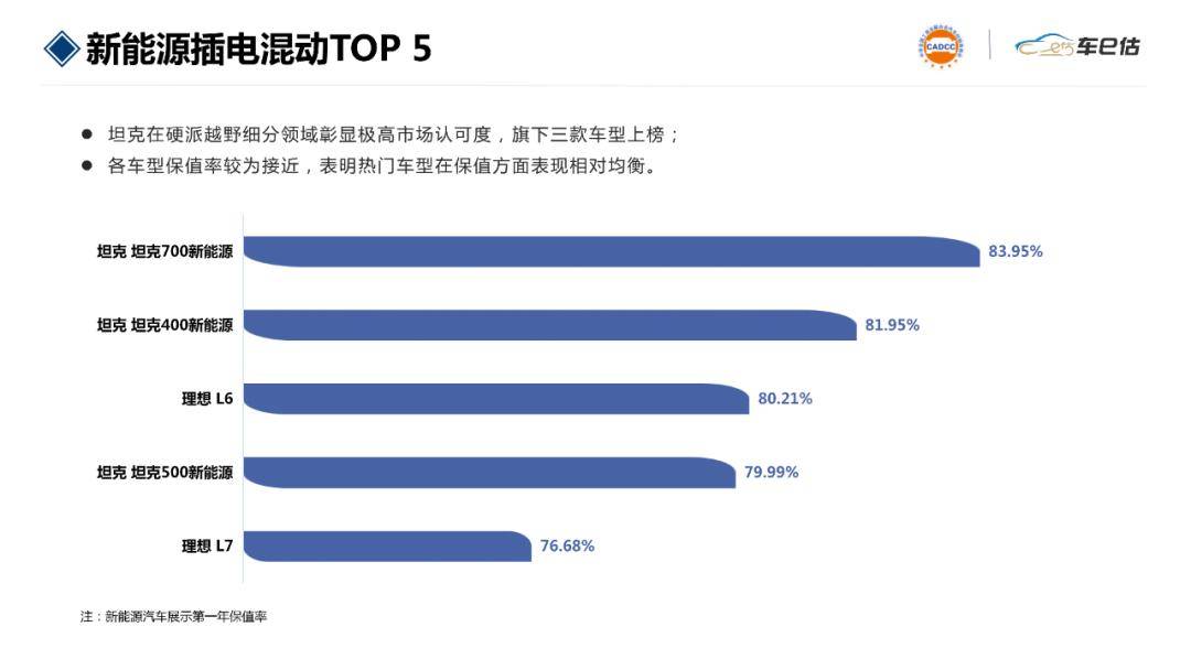上月首度躋身榜單的坦克品牌,本月強(qiáng)勢領(lǐng)跑,一舉占據(jù)榜單多個席位。旗下坦克700新能源、坦克400新能源、坦克500新能源分列榜首、第二和第四名,保值率表現(xiàn)亮眼,依次為83.95%、81.95%、79.99%。該品牌大放異彩,得益于其搭載的先進(jìn)電池技術(shù),既賦予車輛強(qiáng)勁動力,又有效降低油耗。同時(shí),日系品牌硬派越野車逐步退出中國市場,也為坦克品牌創(chuàng)造了更廣闊的發(fā)展空間。而精準(zhǔn)聚焦家庭用戶市場的理想L6、L7,本月排名分別降至第三和第五,保值率分別為80.21%、76.68%。