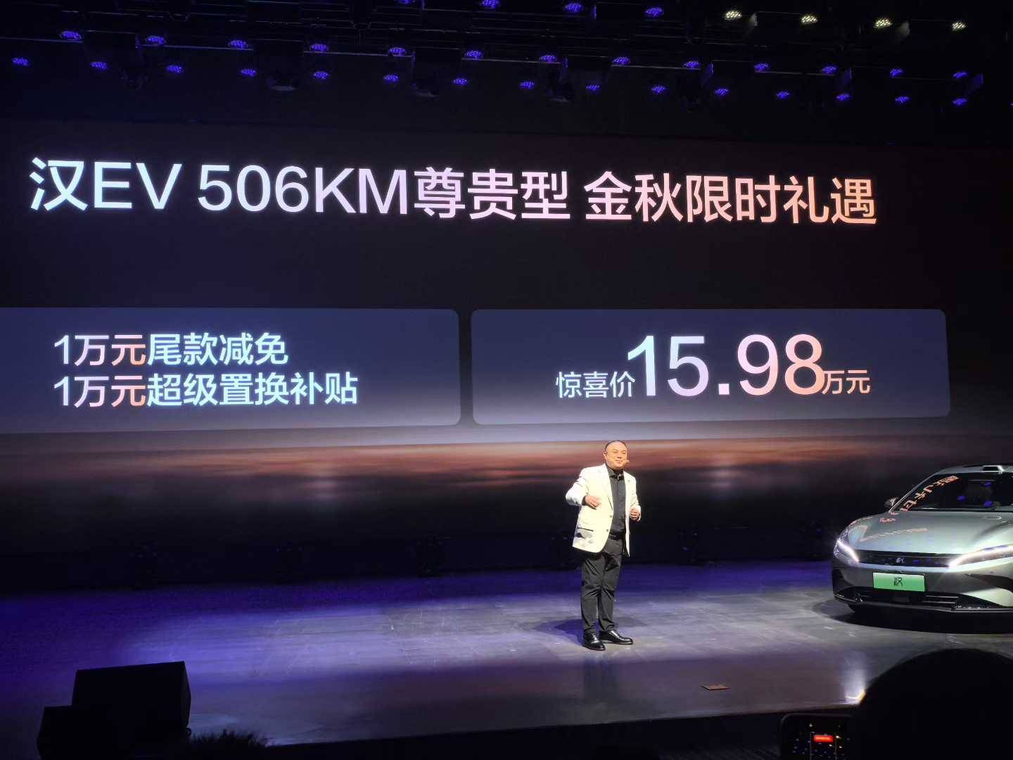 需要特別注意的是,上述價(jià)格為10月31日前完成購(gòu)車(chē)、享受1萬(wàn)元超級(jí)置換補(bǔ)貼后的限時(shí)補(bǔ)貼價(jià)。另外,漢EV 506KM尊貴型同步納入限時(shí)補(bǔ)貼政策,補(bǔ)貼后僅需15.98萬(wàn)元,真正實(shí)現(xiàn)了“油電同價(jià)”。