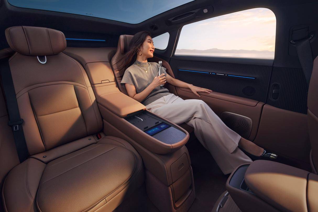 此外,新車搭載全新VIP四座豪華包,后排行政級座椅支持加熱、通風、8點位按摩及5°電動調(diào)節(jié),中央扶手島臺含車載冷暖冰箱與50W無線快充;配備四溫區(qū)空調(diào)與納米水離子健康氧顏艙(凈化空氣同時保濕護膚、柔順秀發(fā));前排雙零重力座椅優(yōu)化造型與材質(zhì),提升腿部支撐與包裹感,緩解長途疲勞。