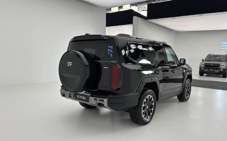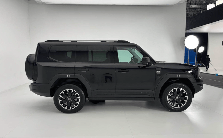 縱橫G700的長寬高分別是5198毫米/2050毫米/1956毫米的,軸距2870毫米,在空間和通過性上取得較好的平衡。車身側面采用了“機甲鎧甲”風格的外擴30毫米輪眉,20 英寸熏黑防脫圈輪轂和全地形 AT 輪胎,突出了越野基因。搭配固定踏板與隱藏式門把手,保持了實用性與運動感。