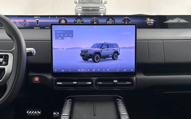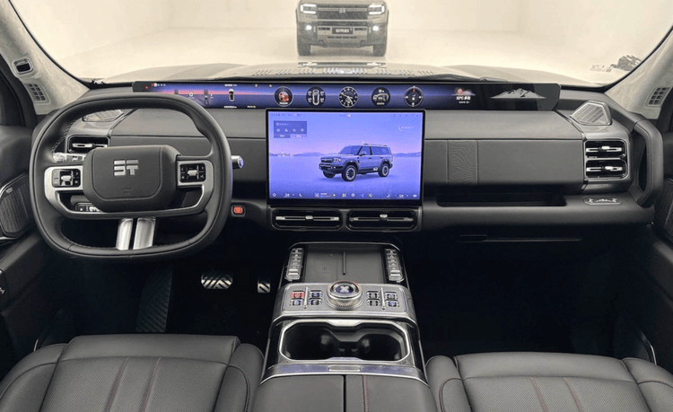 外觀硬朗,內部搭配突出了豪華和實用性結合。內部的80%區域都采用軟質皮質包覆,配合珠峰等高線紋理飾板和金屬鉚釘。科技配置很強,35.4 英寸的天際屏和15.6 英寸懸浮中控屏組成四屏聯動系統,搭載昆侖 OS 車機,支持語音控制和越野模式專屬界面。