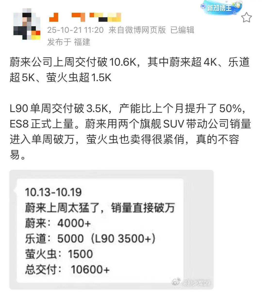 沒想到,蔚來周銷量這么快就過萬了。據汽車博主爆料,蔚來上周交付量達到了1.06萬輛,其中蔚來超4000輛、樂道超5000輛、螢火蟲超1500輛。這也是蔚來有史以來首次單周銷量過萬。