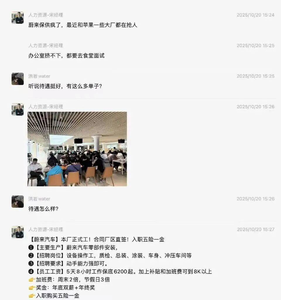 新車訂單的爆單,也給蔚來帶來了幸福的“煩惱”。網傳一張群聊截圖顯示,群內顯示一位負責人力資源工作人員表示,由于ES8訂單太多,蔚來要大量招人保交付。“蔚來保供瘋了,最近和蘋果等大廠都在搶人。”“辦公室都擠不下,都要去食堂面試。”該網友在群里說道。
