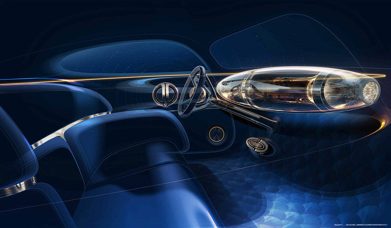 據悉,內飾設計靈感源自華麗的裝飾藝術風格,不僅融入匠心工藝,還采用了特殊材質打造。儀表盤中央設有名為 “齊柏林(Zeppelin)” 的懸浮式玻璃結構,這一極具設計感的造型讓復古指針儀表與數字顯示實現了巧妙互動;玻璃結構后方則鋪設了璀璨的珍珠母貝(mother-of-pearl)鑲嵌裝飾。值得一提的是,車門開啟時,儀表盤會呈現以高端計時碼表為靈感的復古動態效果,為內飾增添了靈動氣息。