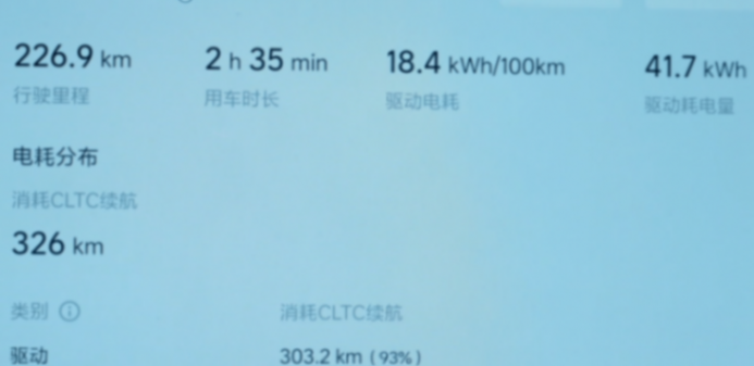 出發時顯示電量是94%,CLTC工況剩余里程是680公里。全程一共跑了226.9公里,不過因為當天下雨路面濕滑,再加上為了補能跑了2公里左右的城區道路,實際平均時速是90.76公里/小時,相比之前的極速焦慮測試時速偏低。而最終剩余電量49%、剩余續航顯示354公里,相當于掉電326公里,整體的續航達成率恰好為70%。同時表顯的驅動能耗是18.4度電,按照表顯給出的驅動能耗占比93%來算,高速綜合能耗為19.8度電/百公里。