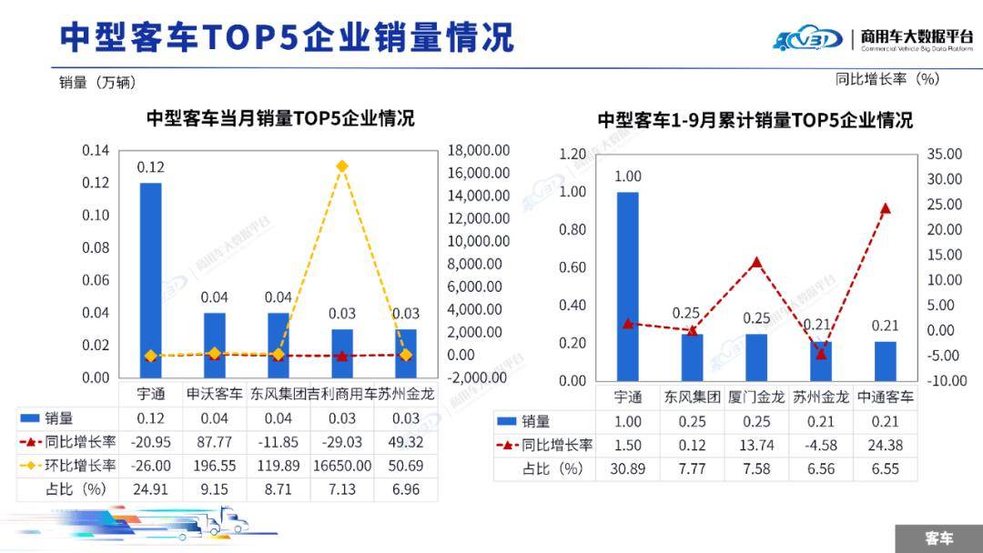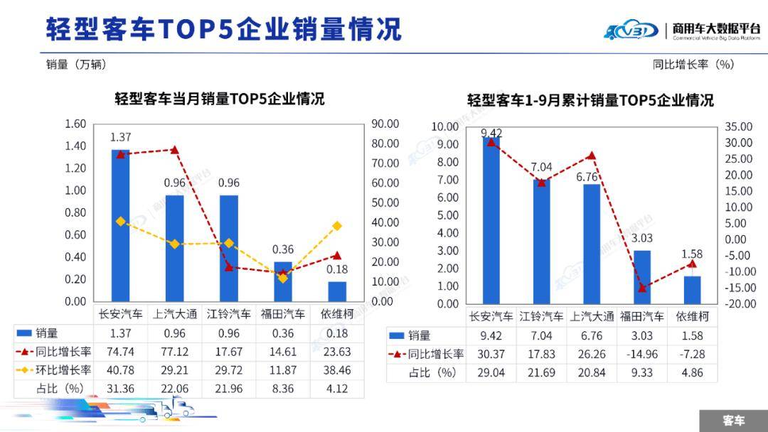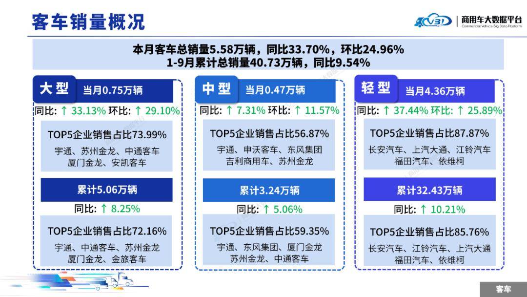 其中大型客車當月銷量0.75萬輛,累計銷量5.06萬輛;中型客車當月銷量0.47萬輛,累計銷量3.24萬輛;輕型客車當月銷量4.36萬輛,累計銷量32.43萬輛。