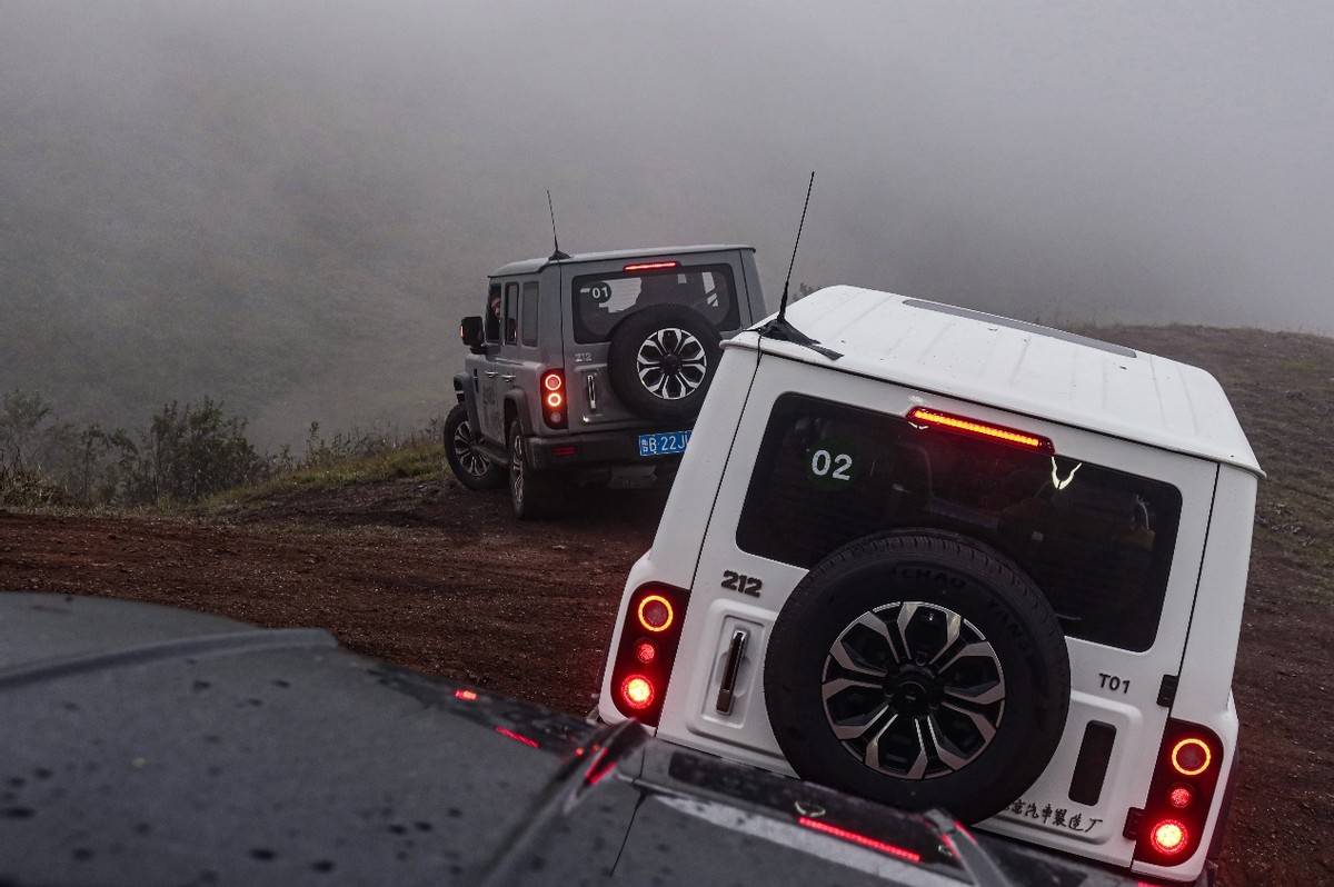 深秋的山區(qū)寒冷多雨,車隊行駛在蜿蜒的國道上,如同一列移動的鋼鐵方舟。212 T01柴油版經(jīng)典的復古方盒子造型早已深入人心無需贅述,圓形大燈、硬朗的車身線條和外掛式備胎,在群山與曠野的映襯下,顯得格外和諧。它不像毫無感情的工業(yè)品,更像一位從自然中生長出來的、沉穩(wěn)而可靠的向?qū)А?/p>