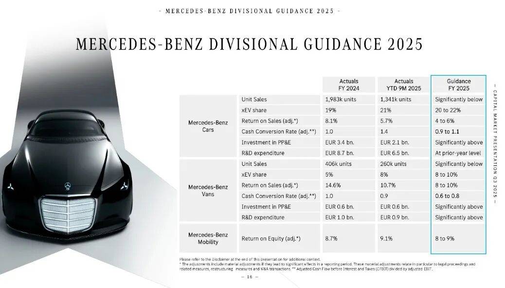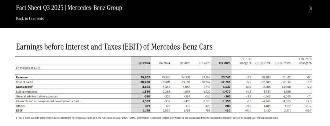 與此同時,三季度奔馳重組計劃(Next Level Performance)大規(guī)模地裁員,產(chǎn)生了約8億歐元的費用。奔馳CFO哈拉爾德·威廉(Harald Wilhelm)表示,這項投入的回報周期短且見效快,預(yù)計在今年年底或2026年初還會有一批人員離職,通過顯著減少人員數(shù)量將進一步降低2026年的人員成本。