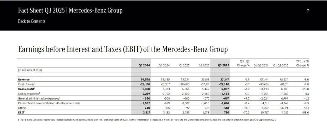 今年三季度,奔馳多項財務(wù)數(shù)據(jù)下滑。財報顯示,三季度,奔馳營收為321.5億歐元,同比下降6.9%;息稅前利潤為7.50億歐元,同比下降70%;調(diào)整后息稅前利潤21.0億歐元,同比下降17%。盡管如此,奔馳三季度現(xiàn)金流達14億歐元;今年前9個月累計現(xiàn)金流為56億歐元,截至第三季度末,工業(yè)凈流動性達到320億歐元,處于相對穩(wěn)健的水平。
