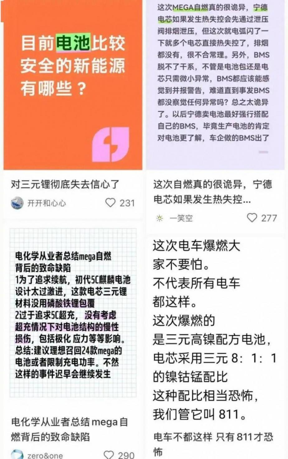 很多人覺得,這是劣幣驅逐良幣,三元鋰電池更高端,成本更高,車企現(xiàn)在都改用磷酸鐵鋰電池,明顯是倒反天罡,但是前陣子我們也說了,磷酸鐵鋰電池的缺點,比如說能量密度、電芯的一致性、低溫衰減等問題,都是可以通過手段去彌補的,但是,三元鋰電池的高成本、熱穩(wěn)定性差,可是很難去解決的,MEGA用的是頂級的三元鋰電池,用了很多隔熱材料,用了出色的BMS去預警,號稱是可以毫秒級響應切斷高壓電路,但是還是沒能撐過10秒。