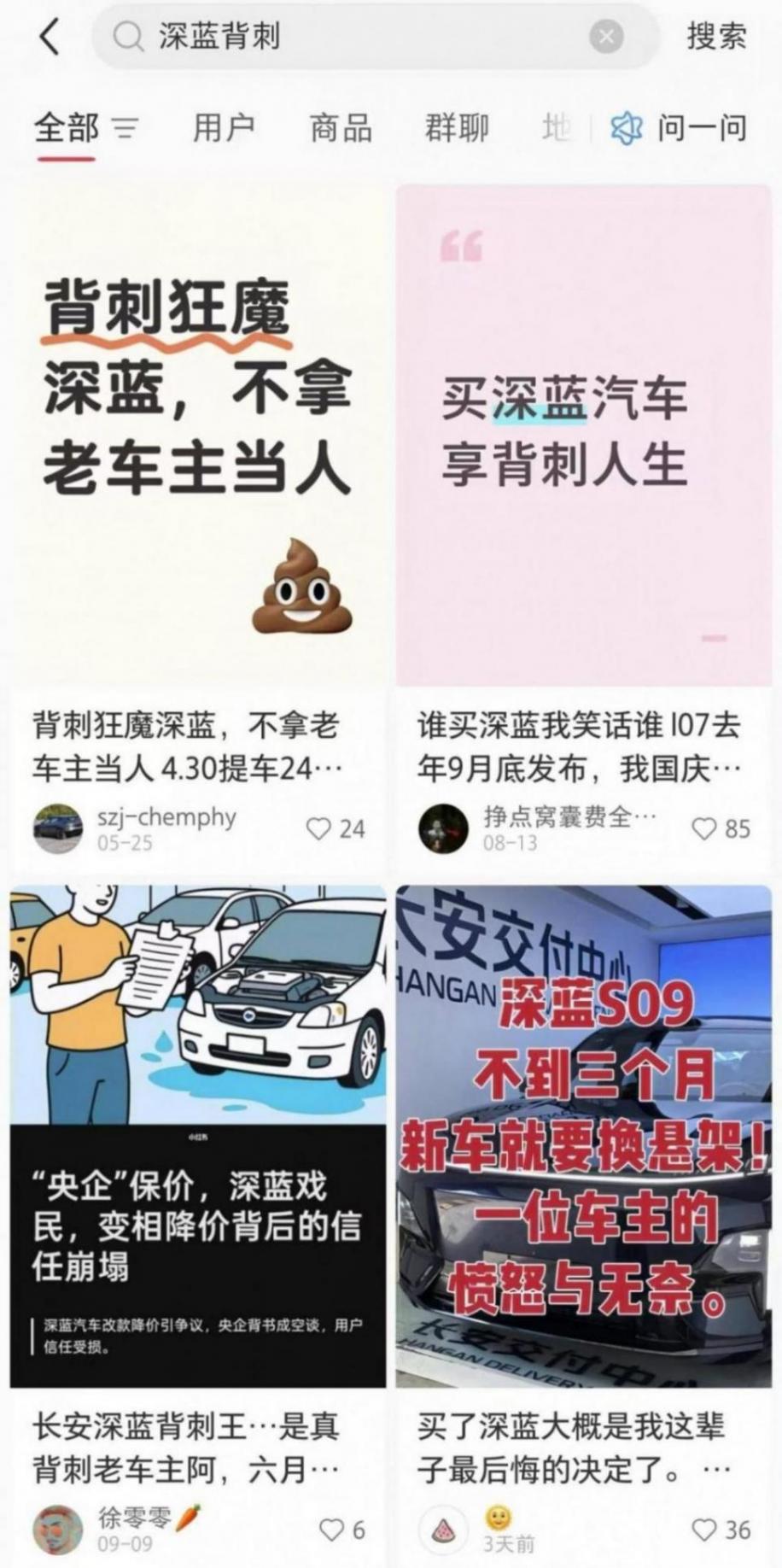 除內部競爭外,深藍汽車還需摘掉“背刺”標簽。打開搜索引擎,以“深藍背刺”為主題的帖子數不勝數,內容普遍指向深藍汽車變相或公然降價的行為,涉及包括深藍S07、S09、SL03以及G318等幾乎所有熱門車型。
