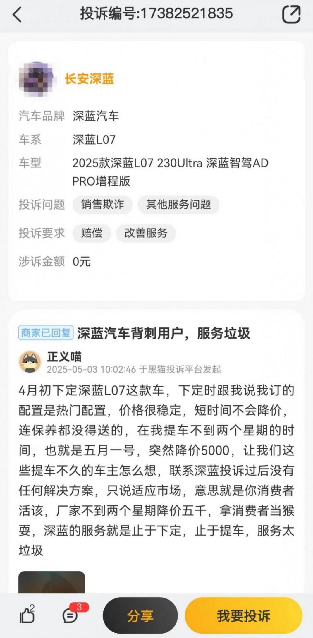 黑貓投訴平臺上,與這一話題相關的投訴也是絡繹不絕。一位深藍L07車主表示,“4月初下定,下定時說訂的是熱門配置,價格很穩定,短時間不會降價,連保養都沒送。提車不到兩個星期,5月1日突然降價5000。聯系深藍投訴過后沒有任何解決方案,只說適應市場。意思就是你消費者活該,拿消費者當猴耍,深藍的服務就是止于下定,止于提車,服務太垃圾。”