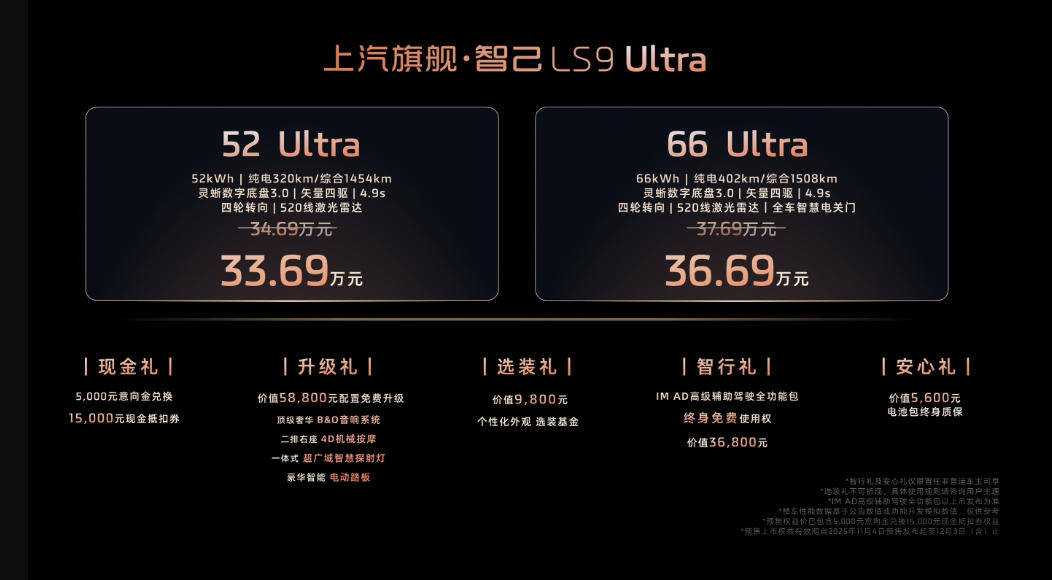 11月4日,智己汽車帶來了年度壓軸之作,首款大型六座SUV——智己LS9正式開啟預售,共推出兩個超級增程版本,全系皆Ultra:其中52 Ultra版,預售權益價33.69萬元;66 Ultra版,預售權益價36.69萬元。新車以長續航、四輪轉向和全系標配激光雷達等硬核優勢切入市場,競爭對手直指理想L9、問界M9等車型。