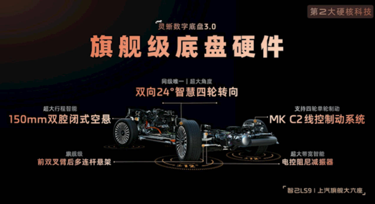 智己LS9還有個賣點就是搭載的靈蜥數字底盤3.0,其具備四輪轉向系統讓后輪最大偏轉10度,5.2米車身掉頭半徑僅5米,尤其是在城區行駛,狹窄路況“一把過”,靈活性完全不輸緊湊型轎車。還有閉式雙腔空氣懸架150mm行程,過減速帶時車身起伏控制在5cm內,濾震表現接近“魔毯”效果,兼顧性能與舒適。