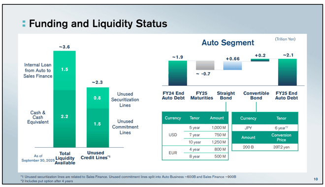 目前,日產(chǎn)汽車擁有3.6萬億日元的可流動性資金,其中包括近2.2萬億日元的現(xiàn)金及現(xiàn)金等價(jià)物儲備和近1.5萬億日元待償還的銷售金融公司貸,以及未使用的信貸額度為2.3萬億日元。