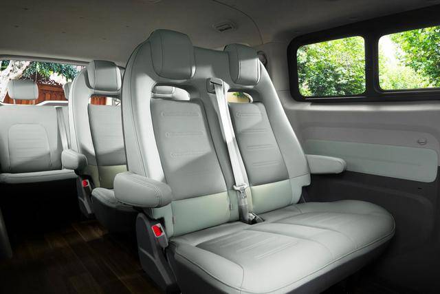 座椅布局則有7座和9座兩種,其中7座版為三排布局,后備箱容積達3.3方,可容納15個26寸行李箱,應對旅游接待等場景得心應手;9座版為四排布局,車廂右側留有485mm的進出過道,但后備箱稍小一些,更適合作為短途通勤班車用途。