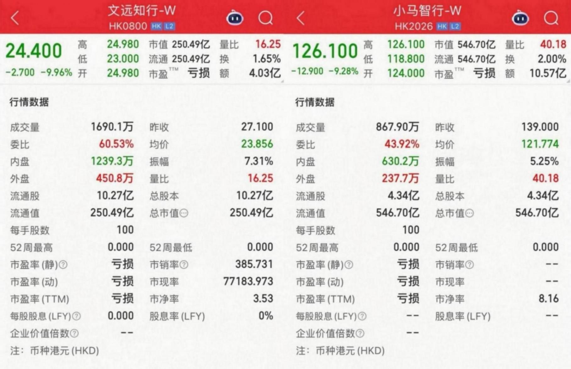 其中,文遠知行發行價為27.1港元,共發行8825萬股,募資22.64億港元。其開盤價23.92港元,跌7.8%,盤中最低23港元,當日收盤價24.4港元,跌幅9.96%,成交額約4.03億港元。