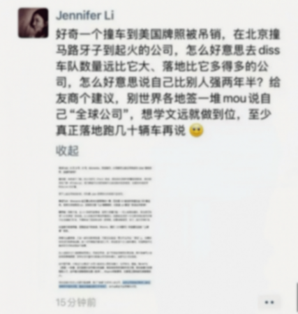 文遠知行CFO李璇隨即在朋友圈暗諷:“好奇一個撞車到美國牌照被吊銷,在北京撞馬路牙子到起火的公司,怎么好意思去diss車隊數量遠比它大、落地比它多得多的公司,怎么好意思說自己比別人強兩年半?”